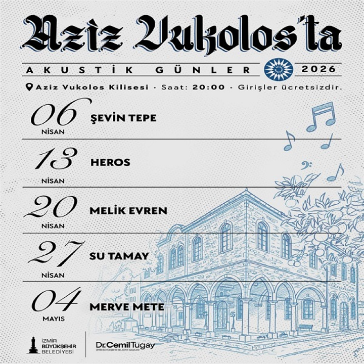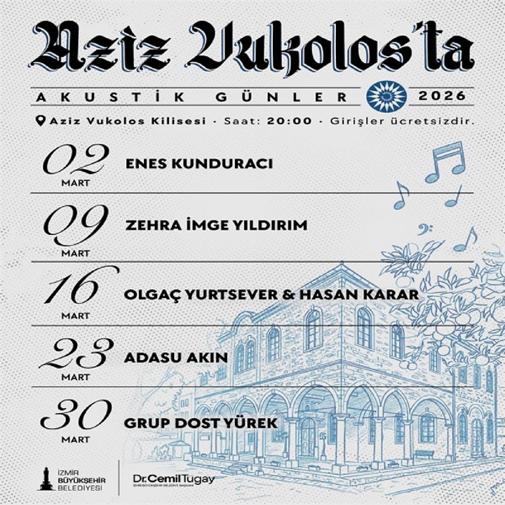 Aziz Vukolos'ta Akustik Günler 2026'da da tüm hızıyla sürecek. Mart, Nisan ve Mayıs programları her Pazartesi Saat:20 00'de Tarihi Aziz Vukolos'ta... değerli hemşerilerimizi bekliyoruz. ( Etiler Mahallesi, 1281. Sk. 11 A, 35240 Konak/İzmir,Tel:0(232) 483 76 20) ÜCRETSİZDİR.