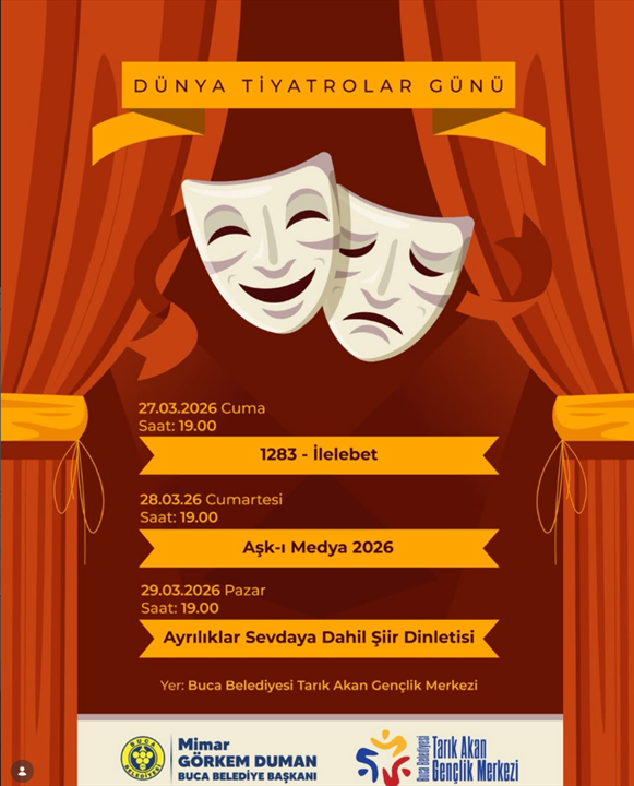 🎭 Dünya Tiyatrolar Günü kapsamında, Tarık Akan Gençlik Merkezi'nde düzenleyeceğimiz etkinliklere tüm gençlerimizi ve sanatseverleri davet ediyoruz.
